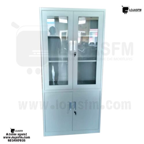 Organize seus materiais com estilo e segurança usando este armário metálico de alta durabilidade. Com duas portas superiores em vidro temperado e duas inferiores em chapa metálica, ele oferece visibilidade e proteção para documentos, medicamentos, utensílios ou equipamentos. Ideal para clínicas, escritórios, escolas e ambientes industriais.